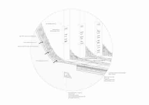 Alt meydanda duvarlar yarım ay şeklinde açılır, zamanın çizdiği kavisin merkezinde bir toplanma ve anma alanı yaratır. Burada mekânsal yoğunluk azalır, hafıza ve zaman yeniden genişler; doğaya, gökyüzüne ve geleceğe açılır.